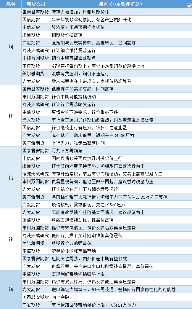 期货公司观点汇总一张图:12月30日有色系(铜、锌、铝、镍、锡等)