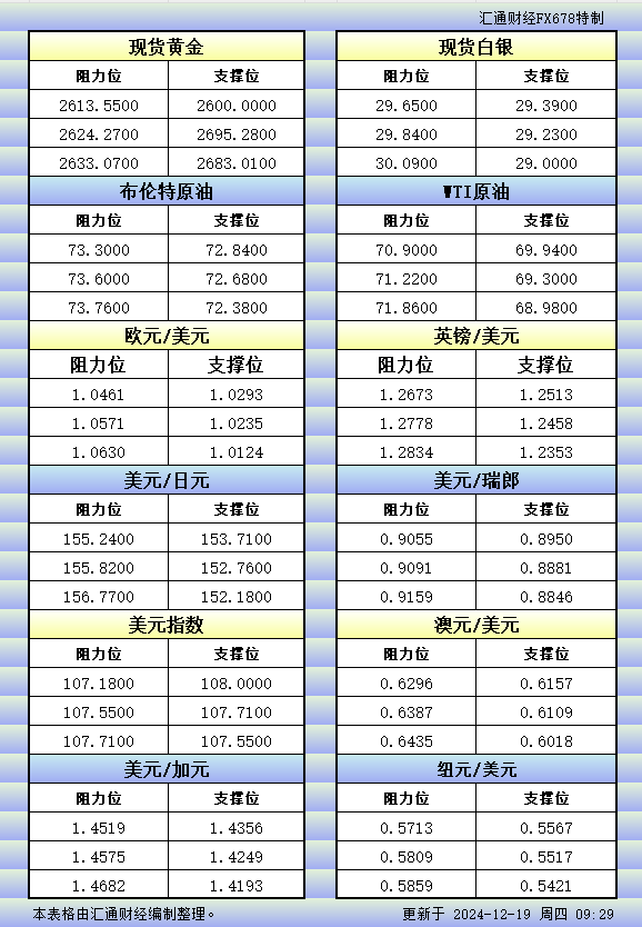 12月19日亚市更新的支撑阻力:金银原油+美元指数等八大货币对