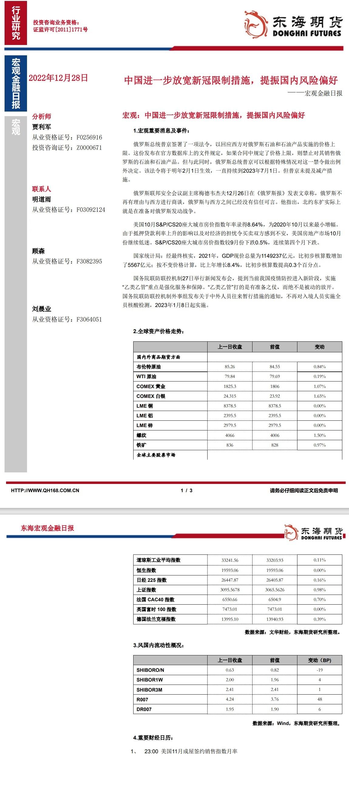 【东海期货12月28日宏观金融日报】:中国进一步放宽新冠限制措施,提振国内风险偏好