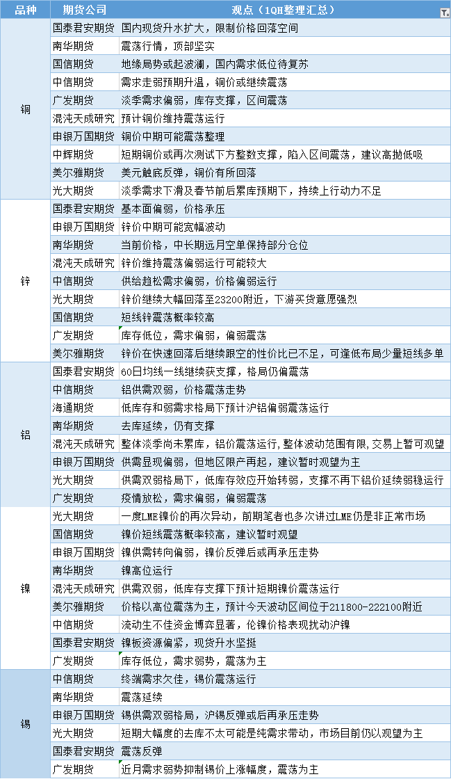 期货公司观点汇总一张图:12月23日有色系(铜、锌、铝、镍、锡等)