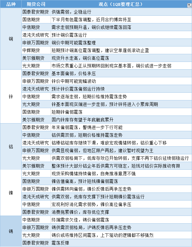 期货公司观点汇总一张图:12月20日有色系(铜、锌、铝、镍、锡等)