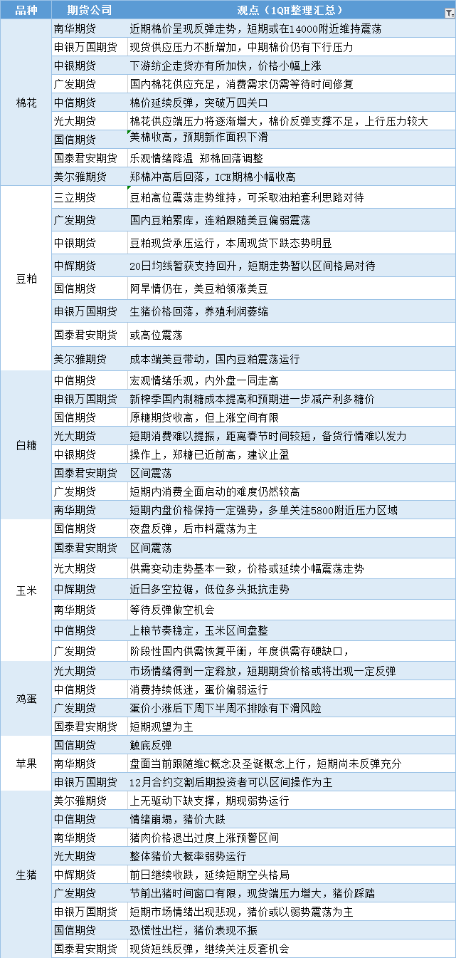 期货公司观点汇总一张图:12月19日农产品(棉花、豆粕、白糖、玉米、鸡蛋、生猪等)