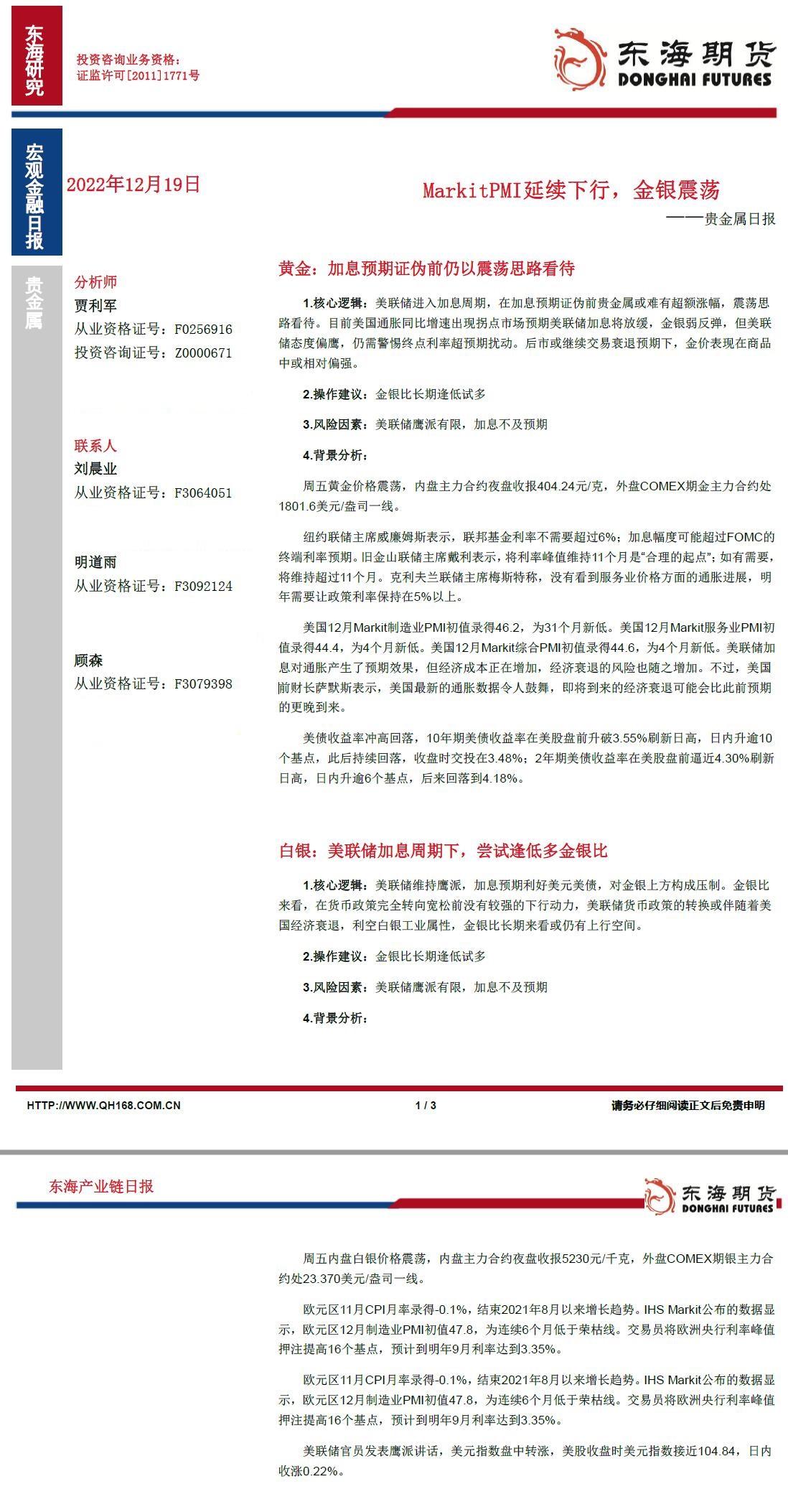 【东海期货12月19日产业链日报】贵金属篇:Markit PMI延续下行,金银震荡