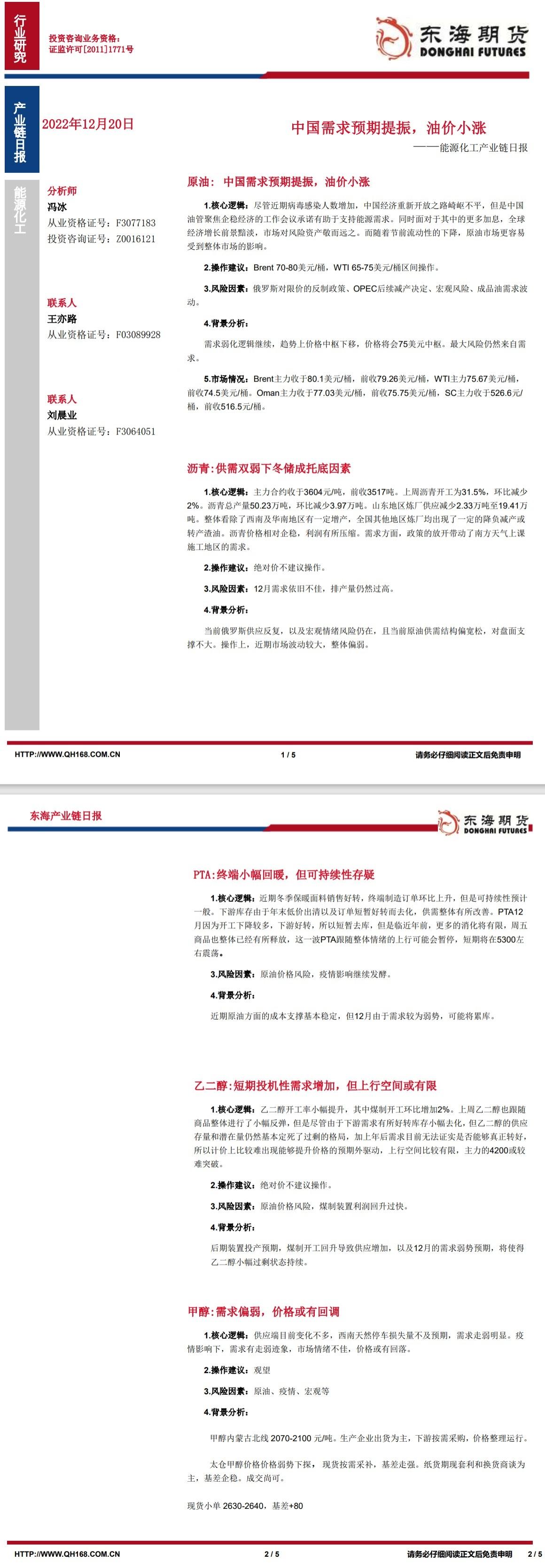 【东海期货12月20日产业链日报】能化篇:中国需求预期提振,油价小涨