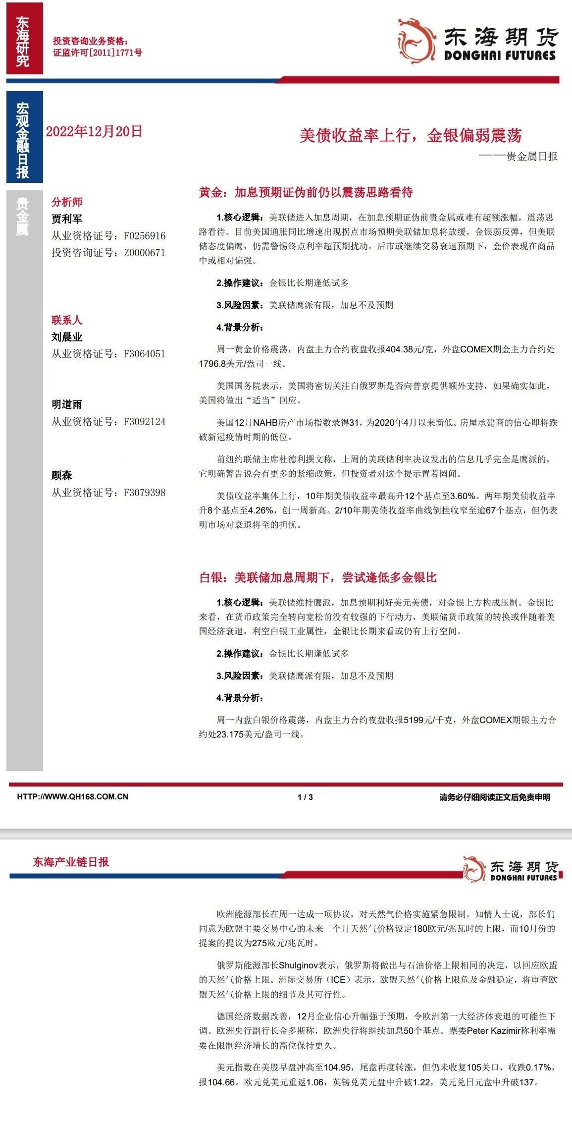 【东海期货12月20日产业链日报】贵金属篇:美债收益率上行,金银偏弱震荡