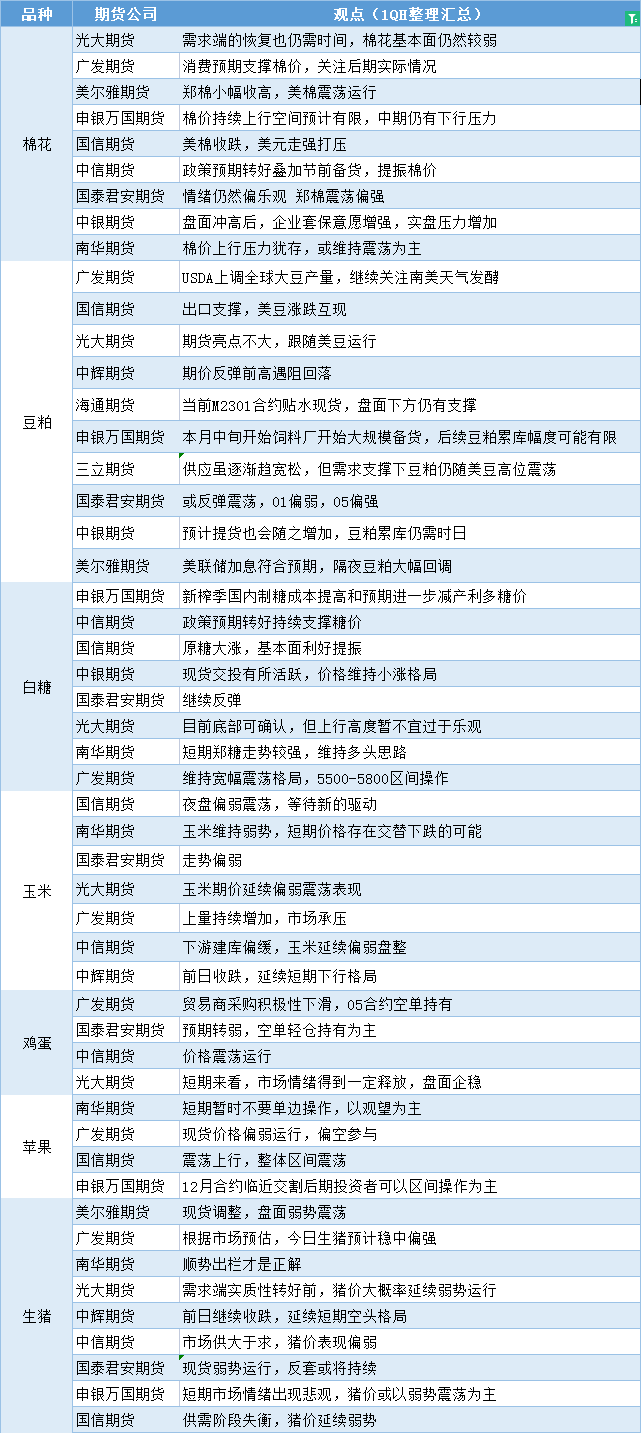 期货公司观点汇总一张图:12月15日农产品(棉花、豆粕、白糖、玉米、鸡蛋、生猪等)