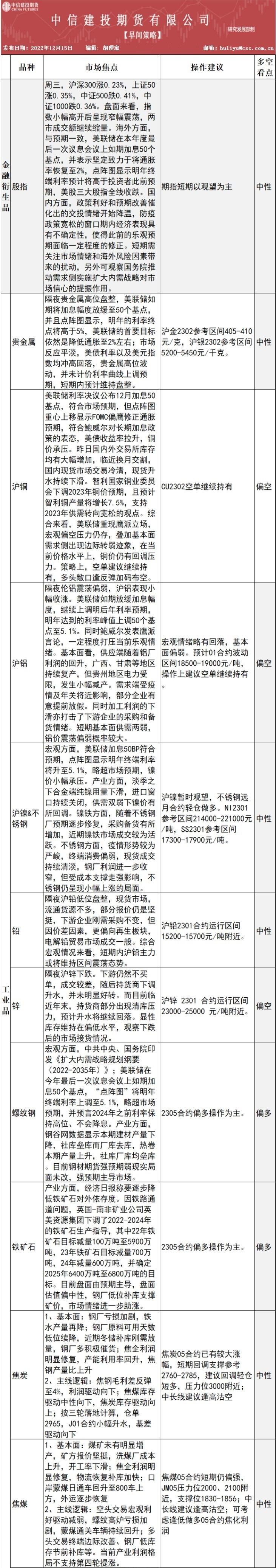 中信建投期货12月15日早间交易策略