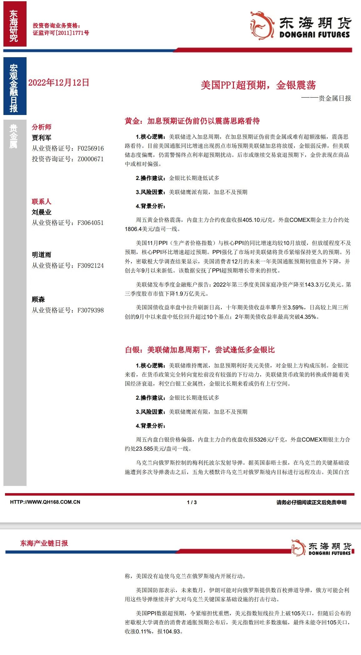 【东海期货12月12日宏观金融日报】:美国PPI超预期,短期强化美联储加息预期