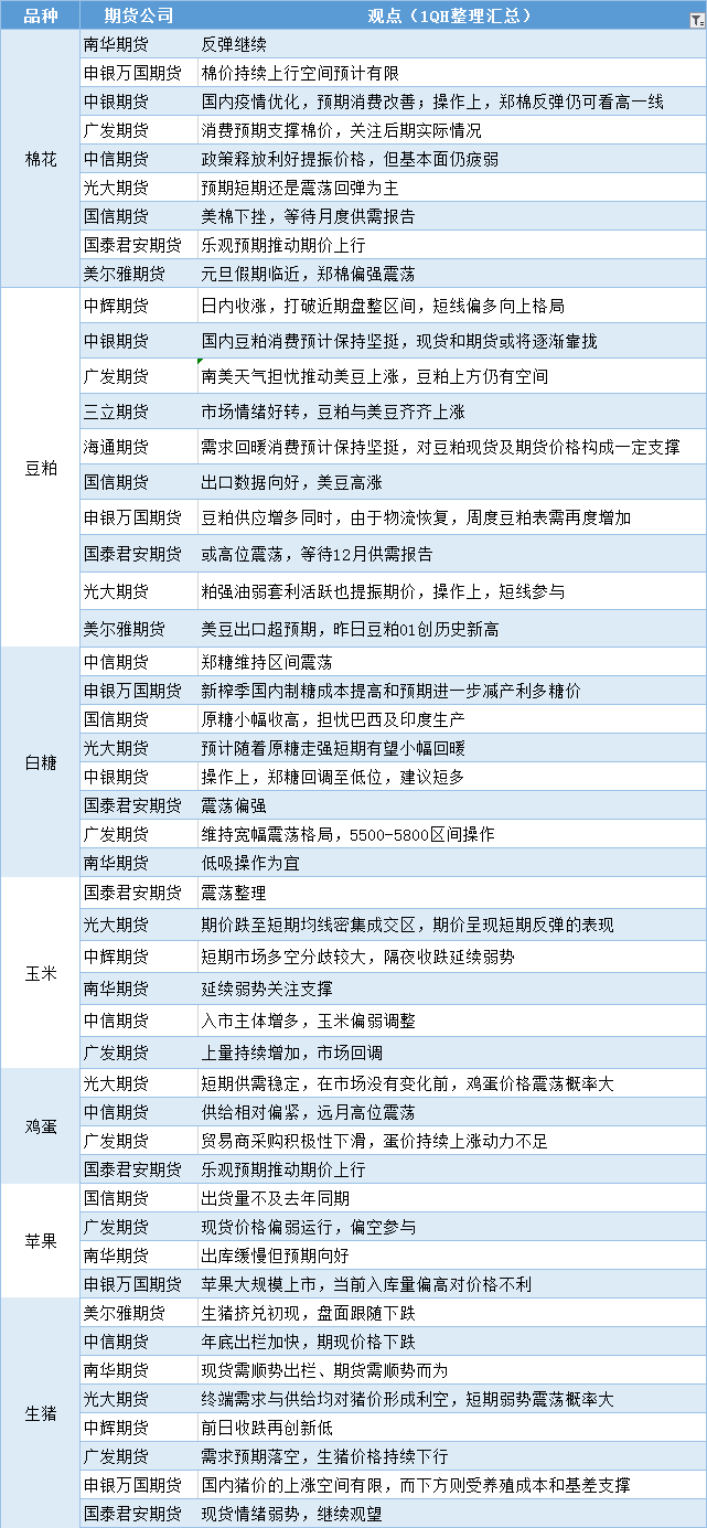 期货公司观点汇总一张图:12月9日农产品(棉花、豆粕、白糖、玉米、鸡蛋、生猪等)