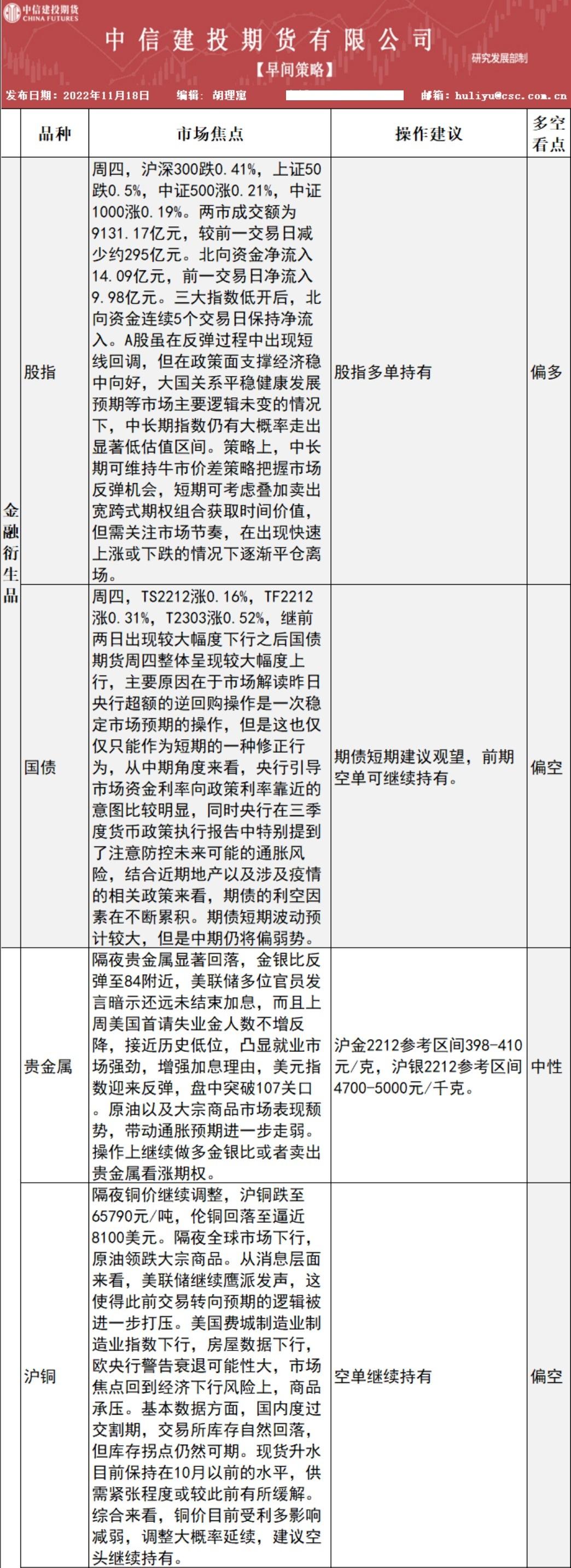 中信建投期货11月18日早间交易策略
