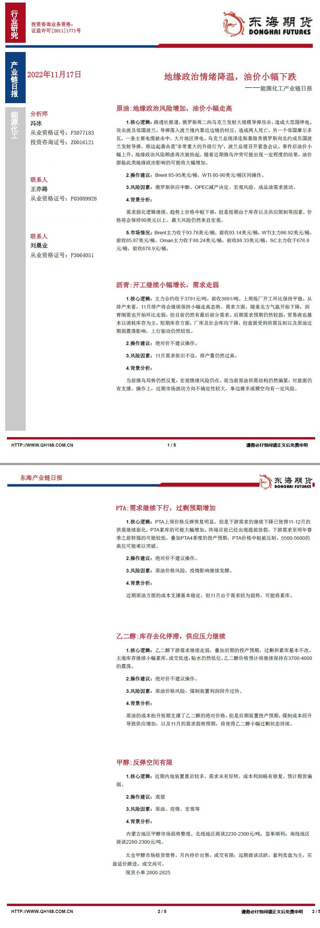 【东海期货11月17日产业链日报】能化篇:地缘政治情绪降温,油价小幅下跌