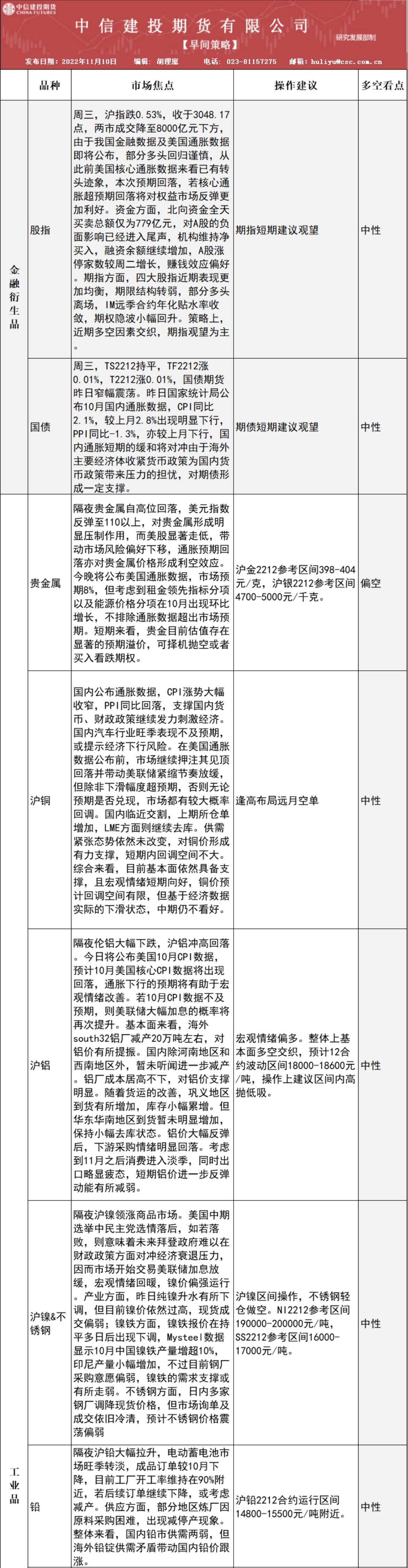 中信建投期货11月10日早间交易策略