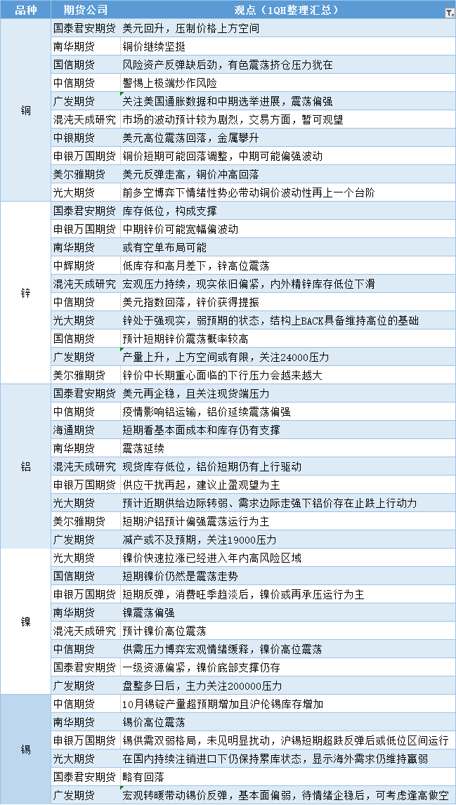 期货公司观点汇总一张图:11月10日有色系(铜、锌、铝、镍、锡等)