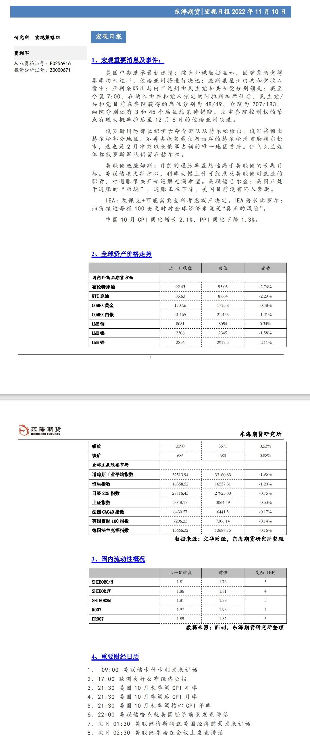 【东海期货11月10日宏观日报】:美元大幅反弹,全球风险偏好短期降温