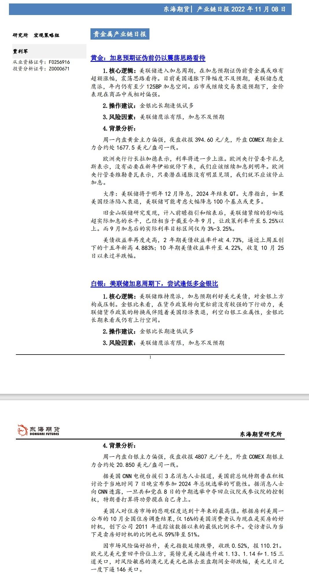 【东海期货11月8日产业链日报】贵金属篇:风险偏好抬升,银价偏强运行