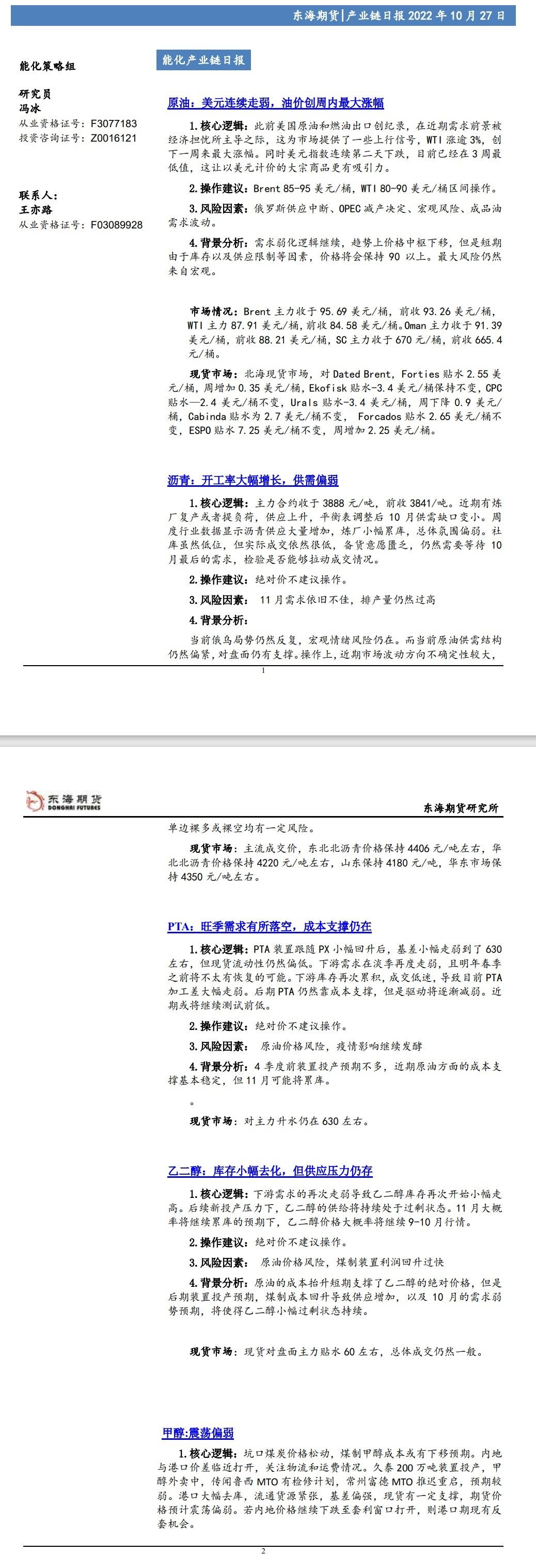 【东海期货10月27日产业链日报】能化篇:美元连续走弱,油价创周内最大涨幅