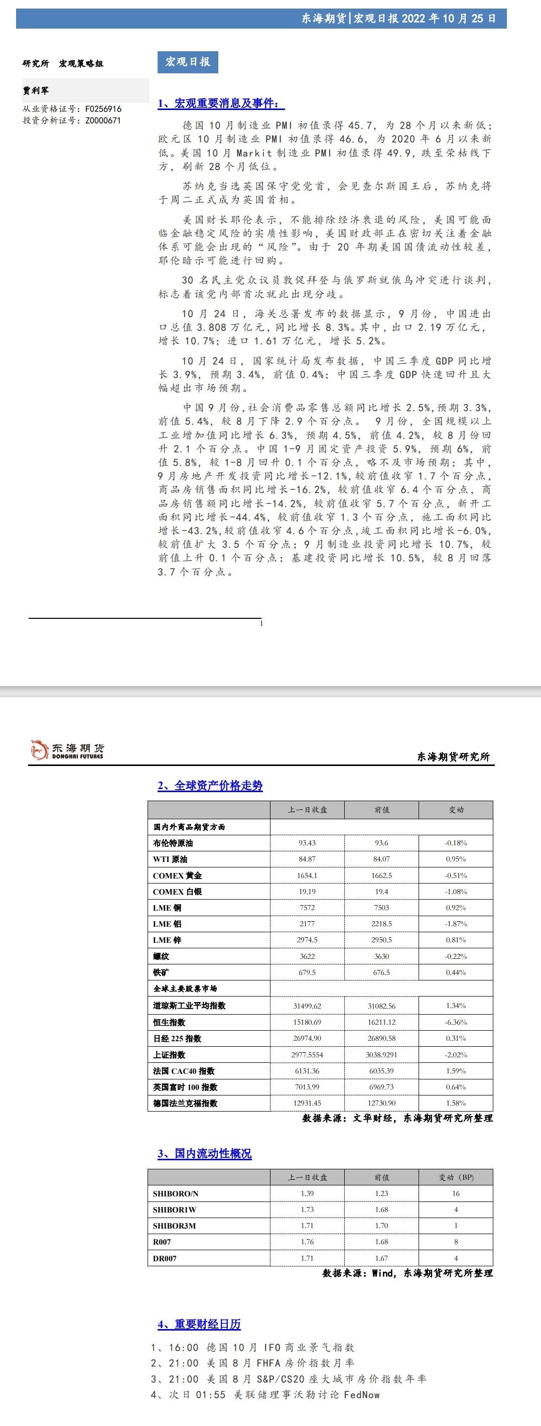 【东海期货10月25日宏观日报】:国内9月经济不及预期,股市和汇率大跌