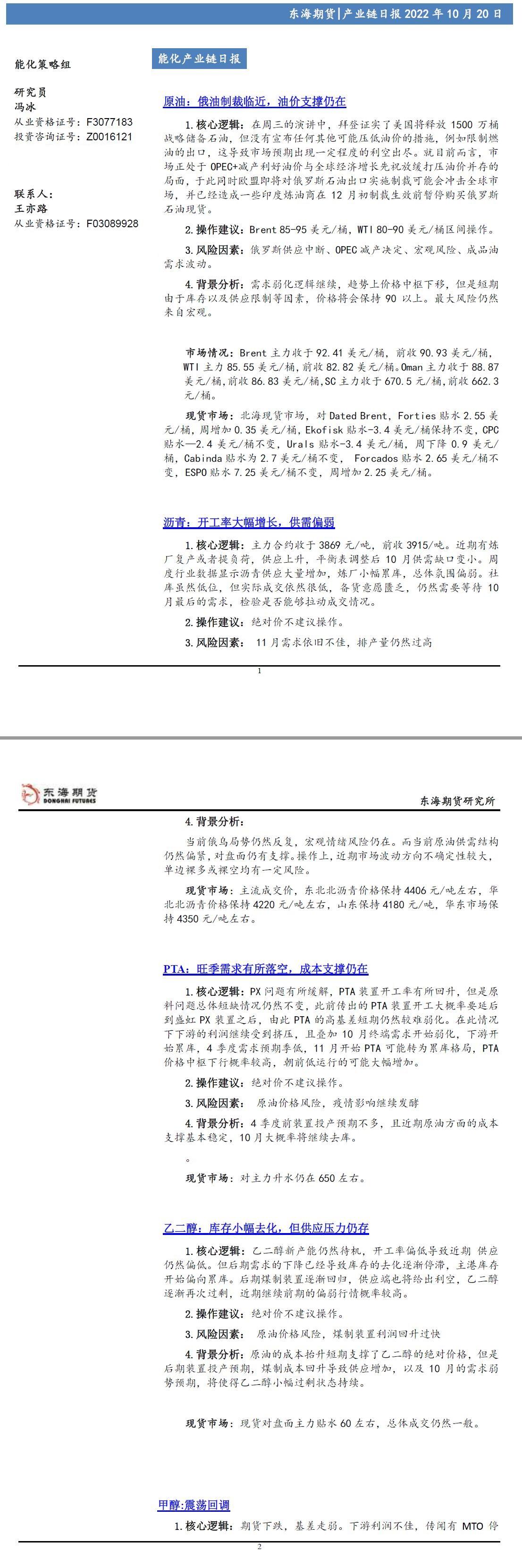 【东海期货10月20日产业链日报】能化篇:俄油制裁临近,油价支撑仍在