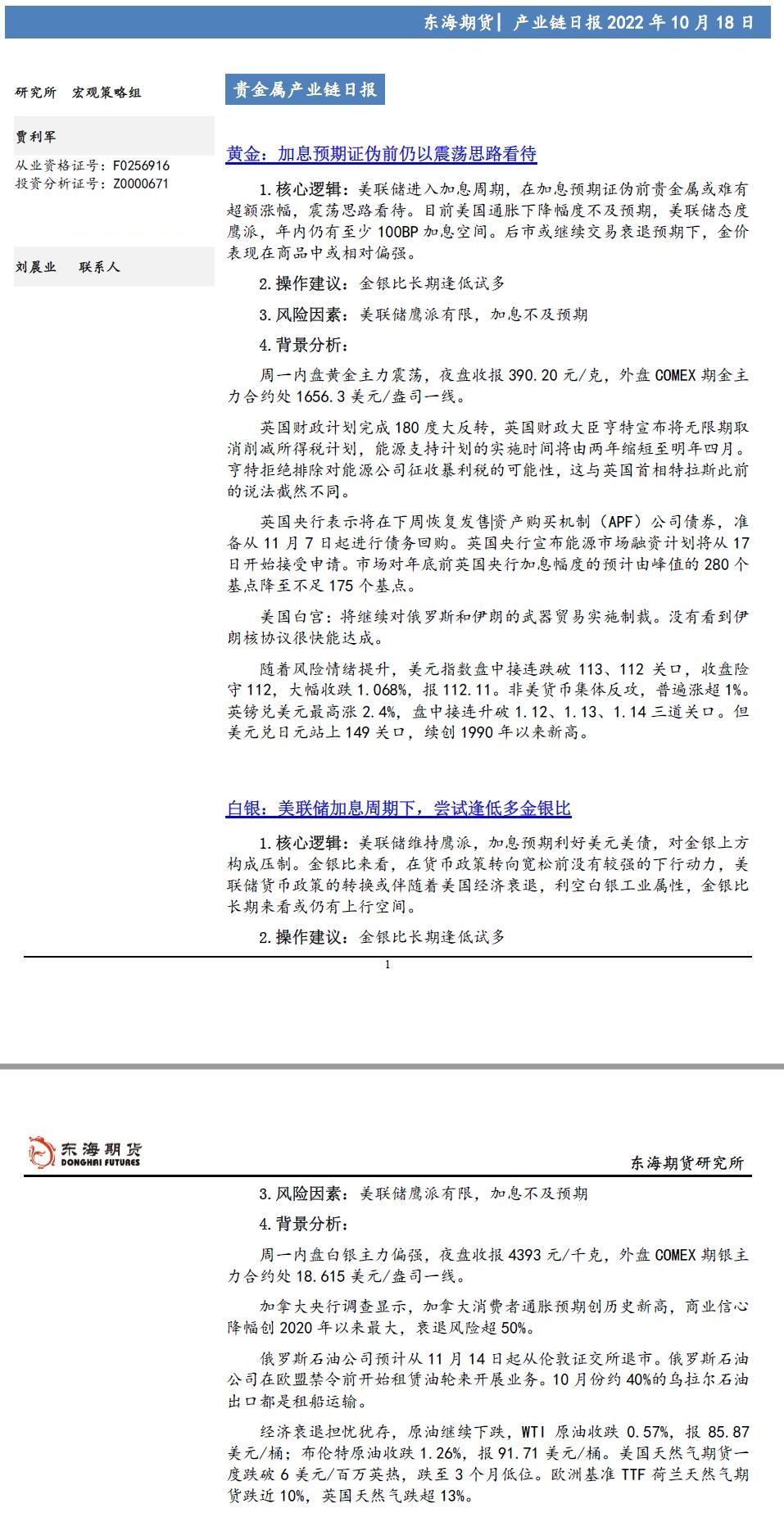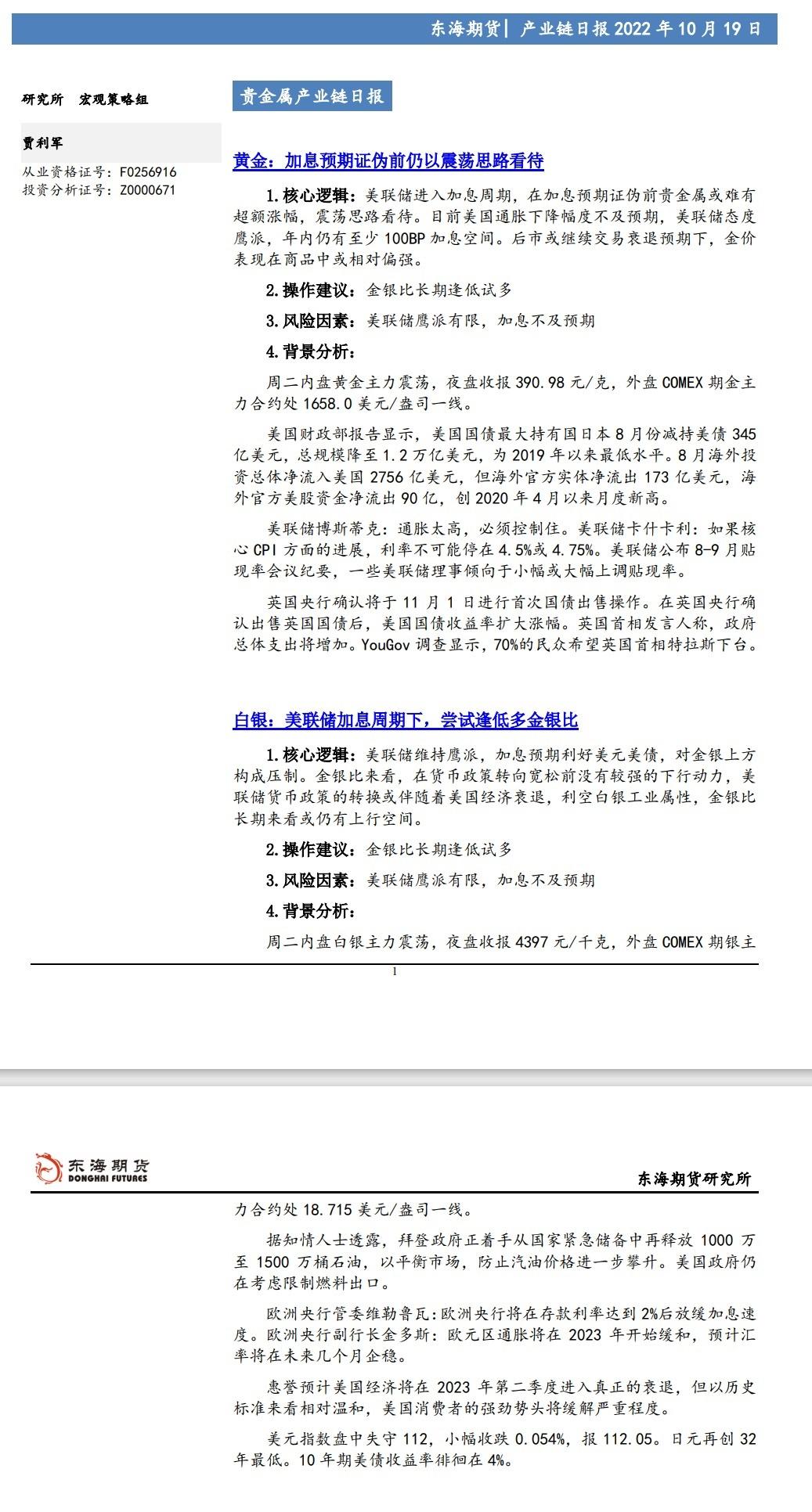 【东海期货10月19日产业链日报】贵金属篇:美联储官员发言鹰派,金银震荡