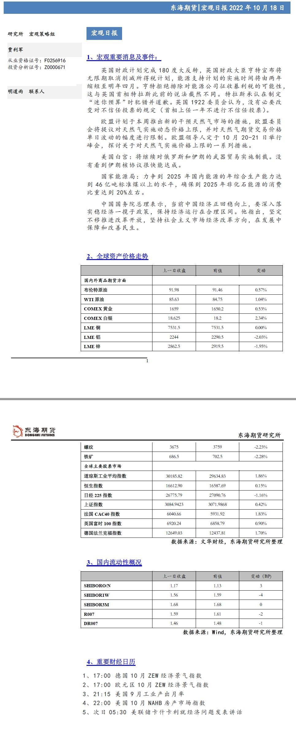 【东海期货10月18日宏观日报】英国经济计划大逆转,全球风险偏好大幅升温