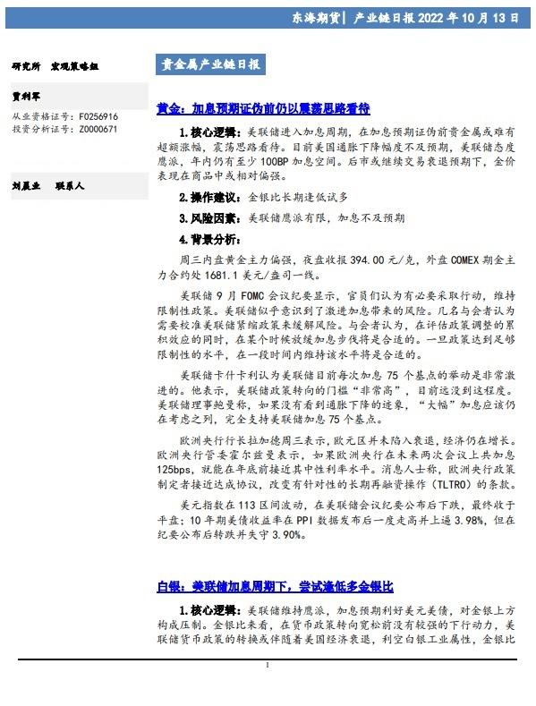 【东海期货10月13日产业链日报】贵金属篇:美联储会议纪要鹰中有鸽,金银短线反弹