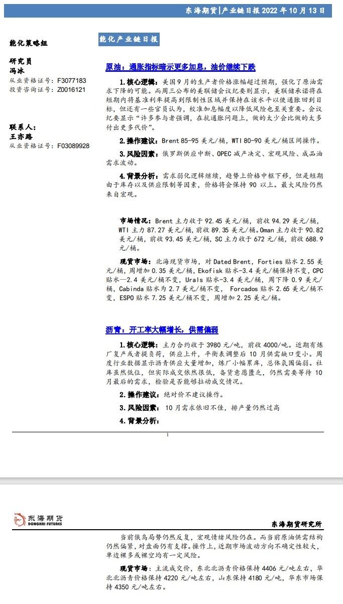 【东海期货10月13日产业链日报】能化篇:通胀指标暗示更多加息,油价继续下跌