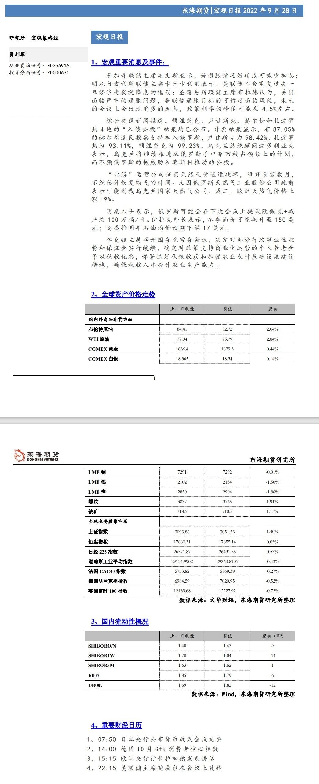 【东海期货9月28日宏观日报】:美联储官员继续放鹰,美元持续偏强运行