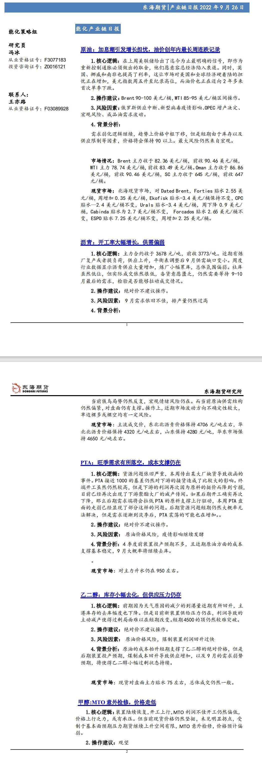 【东海期货9月26日产业链日报】能化篇:加息潮引发增长担忧,油价创年内最长周连跌记录