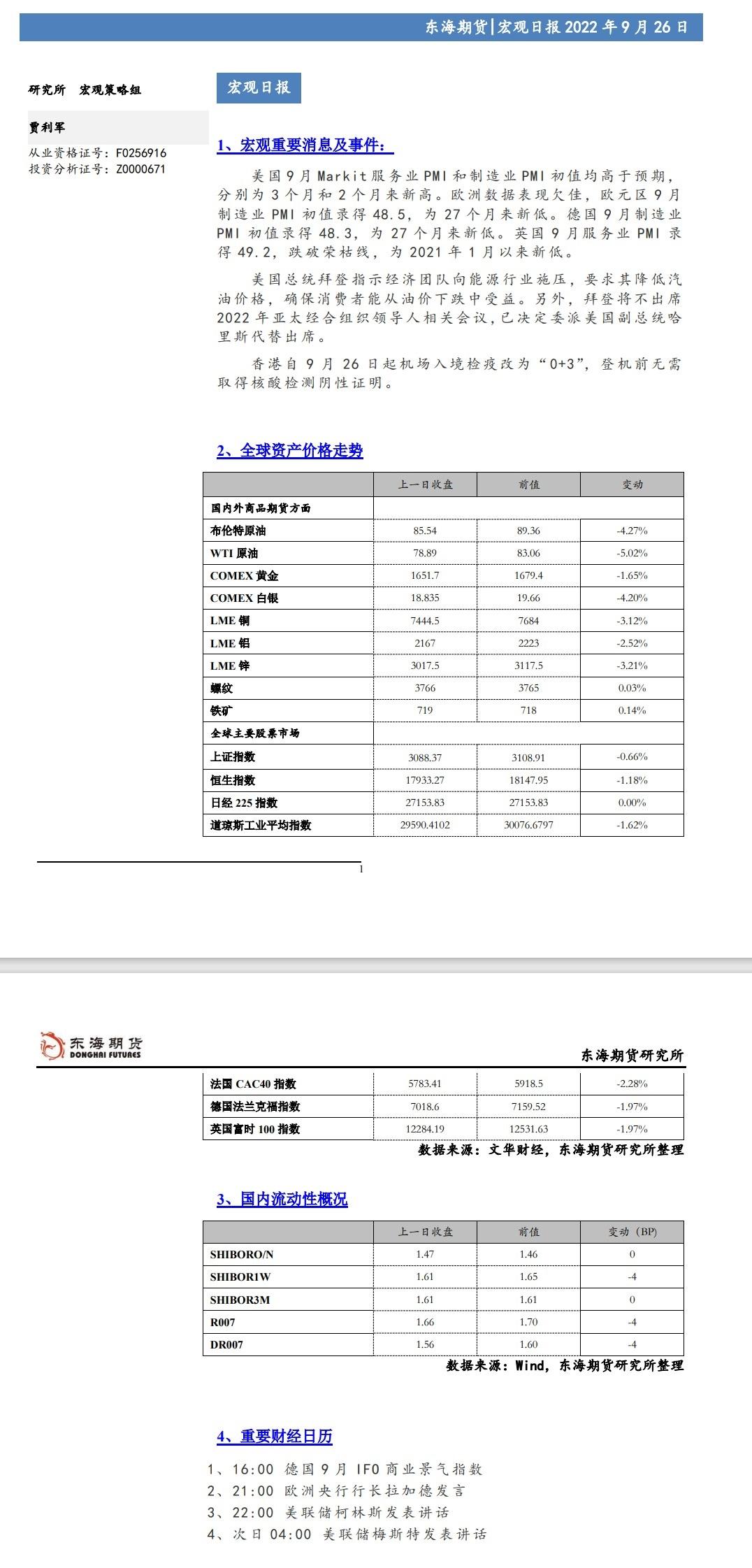 【东海期货9月26日宏观日报】:经济衰退担忧加深,全球风险资产大幅下跌