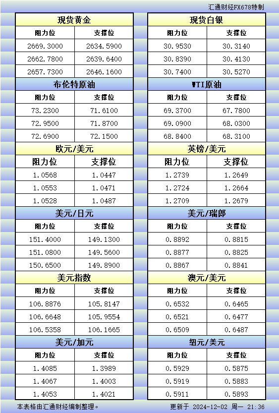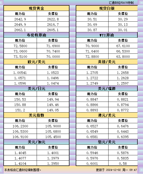 12月2日美市更新的支撑阻力:金银原油+美元指数等八大货币对