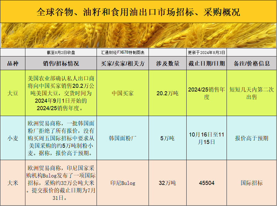 全球谷物、油籽和食用油出口市场招标、采购概况: