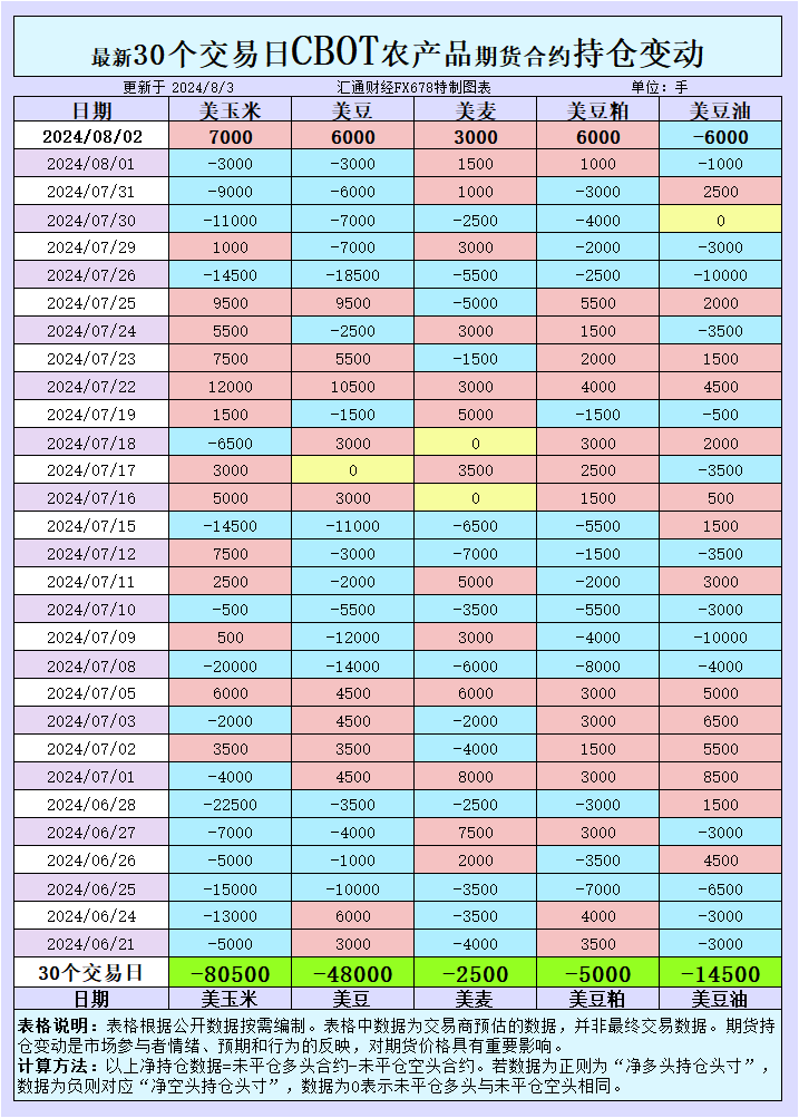 增加CBOT玉米投机性净多头;增加CBOT大豆投机性净多头;增加CBOT小麦投机性净多头;增加CBOT豆粕投机性净多头;增加CBOT豆油投机性净空头。