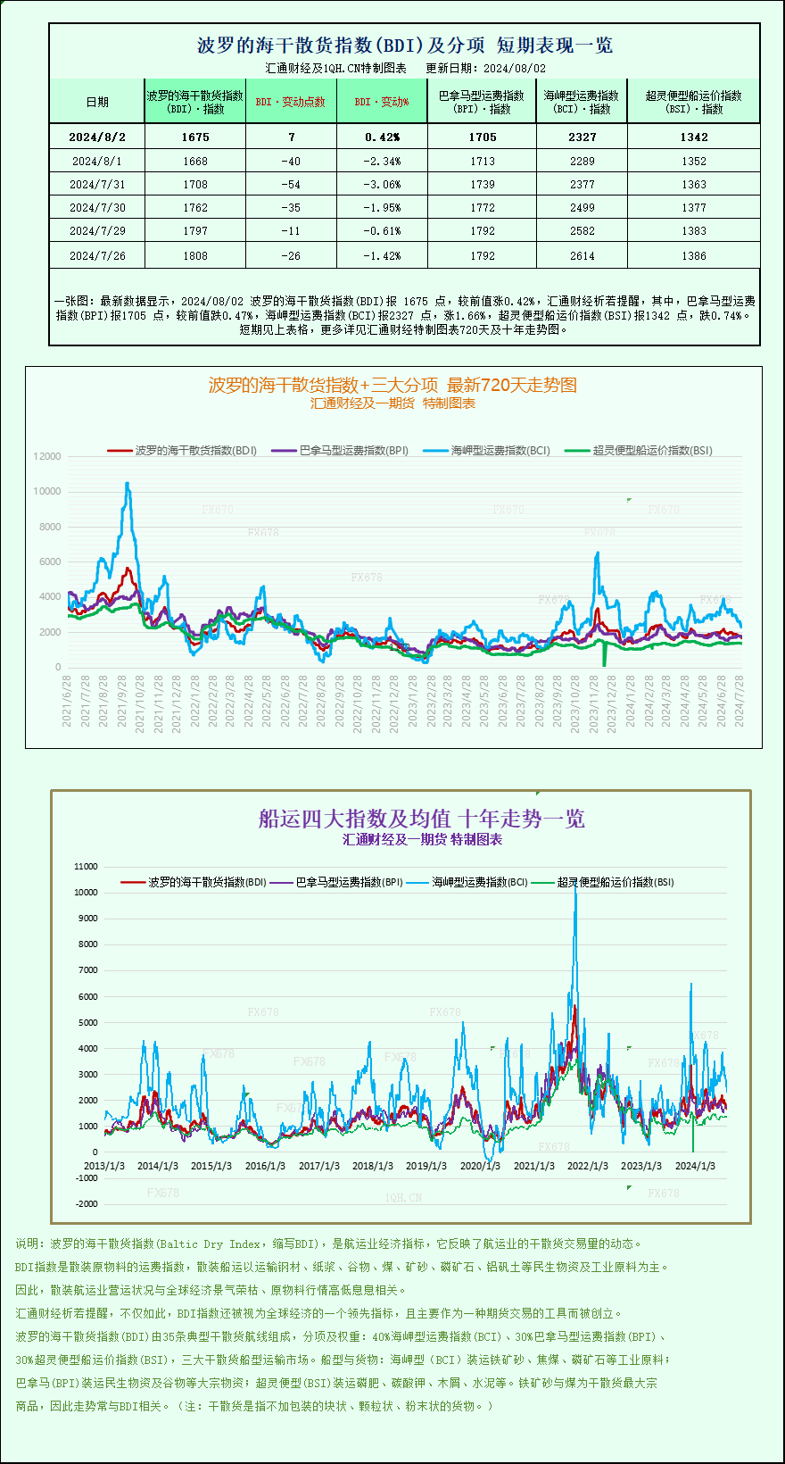 最新数据显示,2024/08/02波罗的海干散货指数(BDI)报1675点,较前值涨0.42%,其中,巴拿马型运费指数(BPI)报1705点,较前值跌0.47%,海岬型运费指数(BCI)报2327点,涨1.66%,超灵便型船运价指数(BSI)报1342点,跌0.74%。波罗的海干散货指数+三大分项的最新720天走势图、十年走势图等详见汇通财经特制图表。
