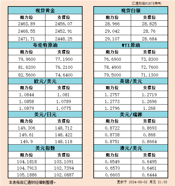 标题:8月2日美市支撑阻力:金银原油+美元指数等六大货币对