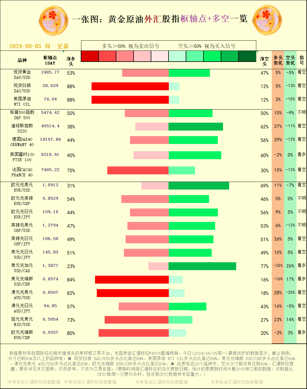 标题:一张图:2024/08/05黄金原油外汇股指"枢纽点+多空占比"一览