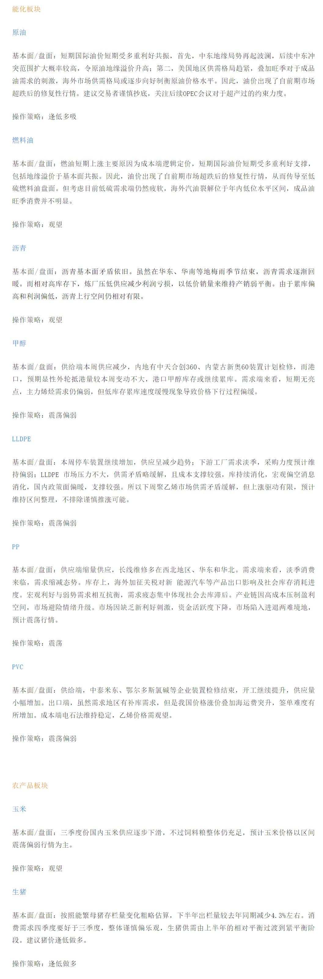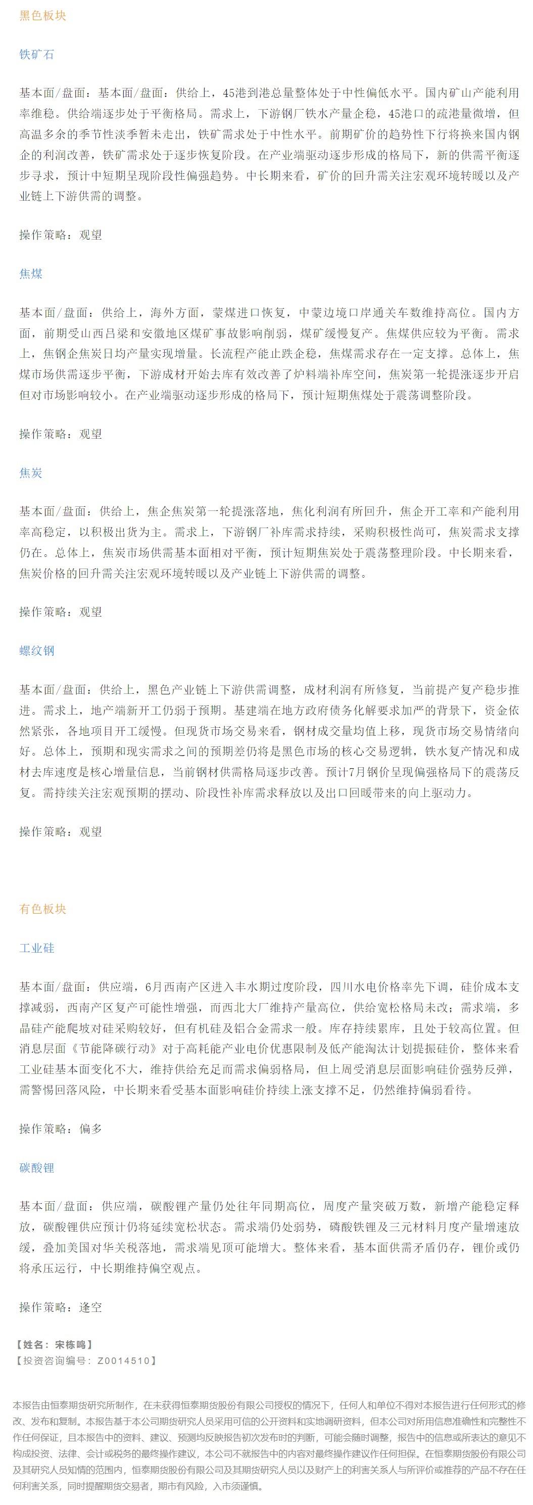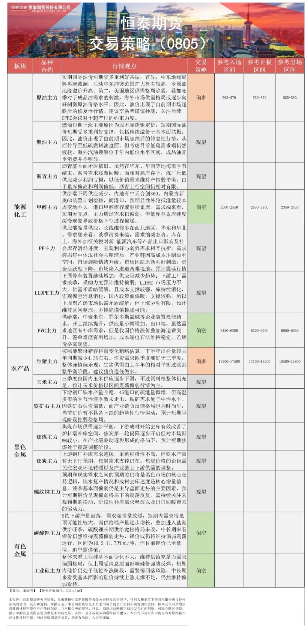 以下是恒泰期货今日早间交易策略,覆盖品种有:原油燃料油等能源化工、玉米生猪等农产品、黑色系如铁矿石焦煤焦炭螺纹钢、有色系如工业硅碳酸锂等。