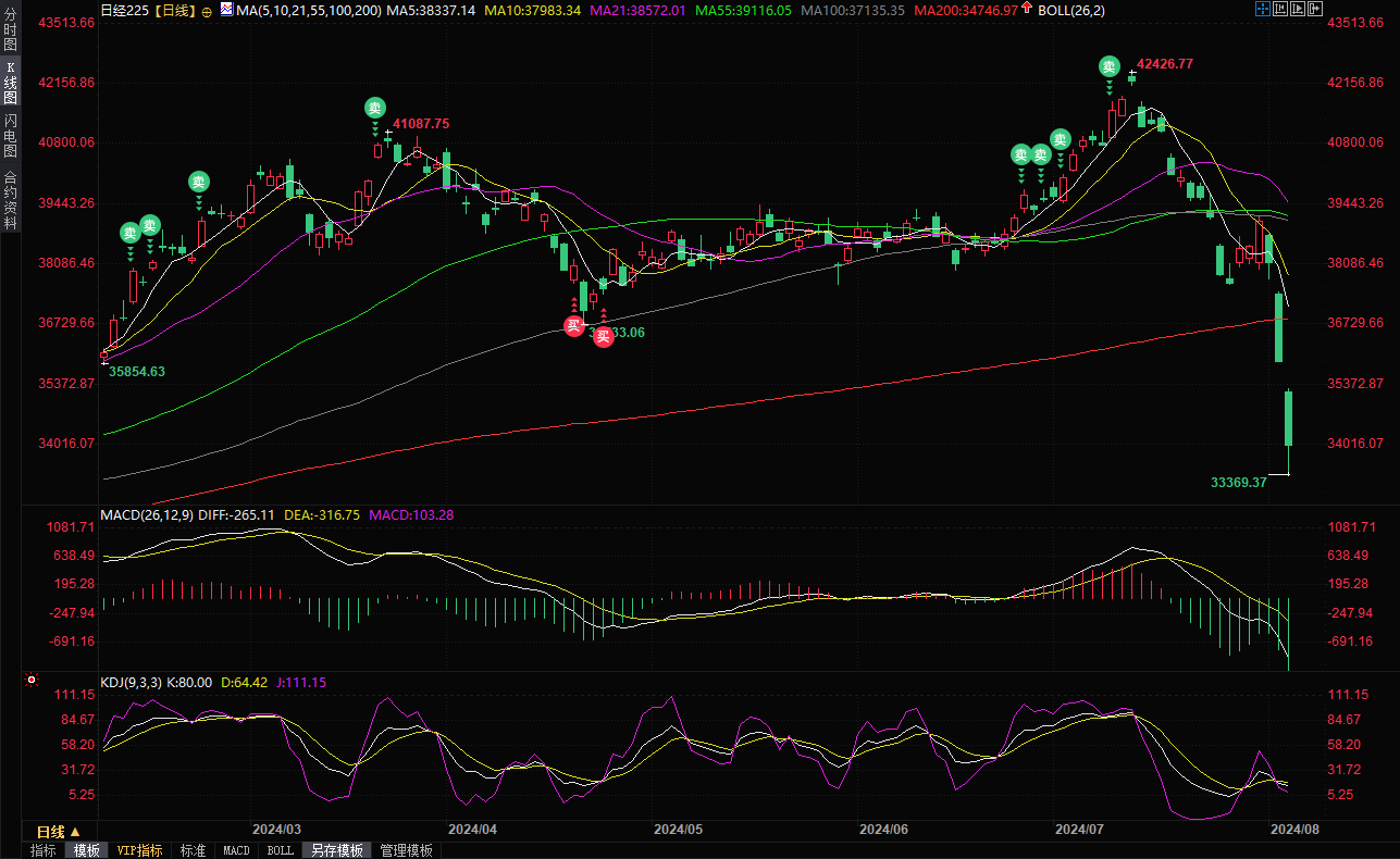 日经225指数跌势不止,跌幅扩大至7%,失守34000点,较7月所创历史新高下跌逾20%,陷入技术性熊市。