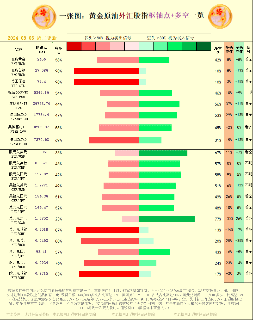 标题:一张图:2024/08/06黄金原油外汇股指"枢纽点+多空占比"一览