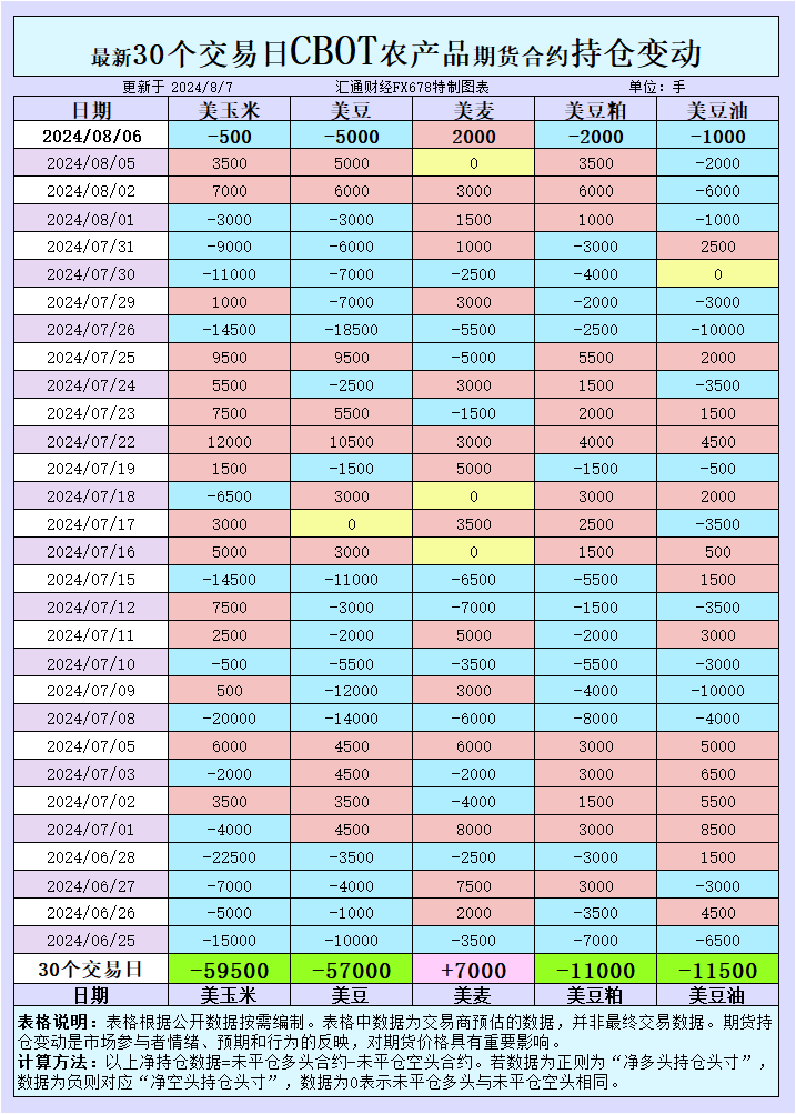 增加CBOT玉米投机性净空头;增加CBOT大豆投机性净空头;增加CBOT小麦投机性净多头;增加CBOT豆粕投机性净空头;增加CBOT豆油投机性净空头。
