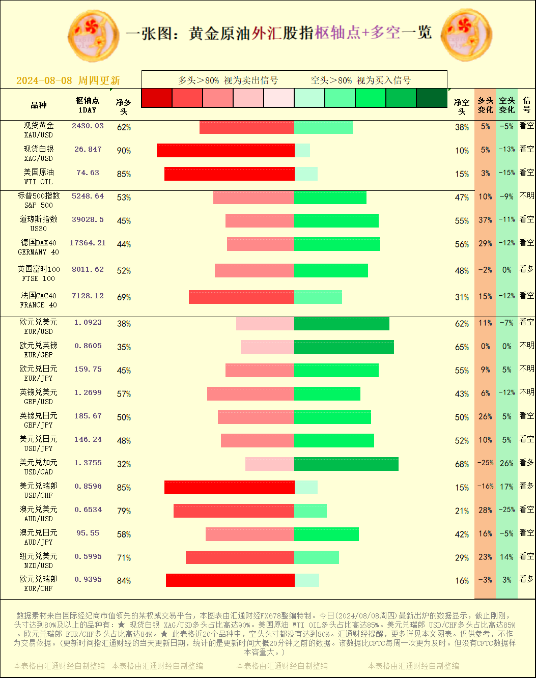标题:一张图:2024/08/08黄金原油外汇股指"枢纽点+多空占比"一览