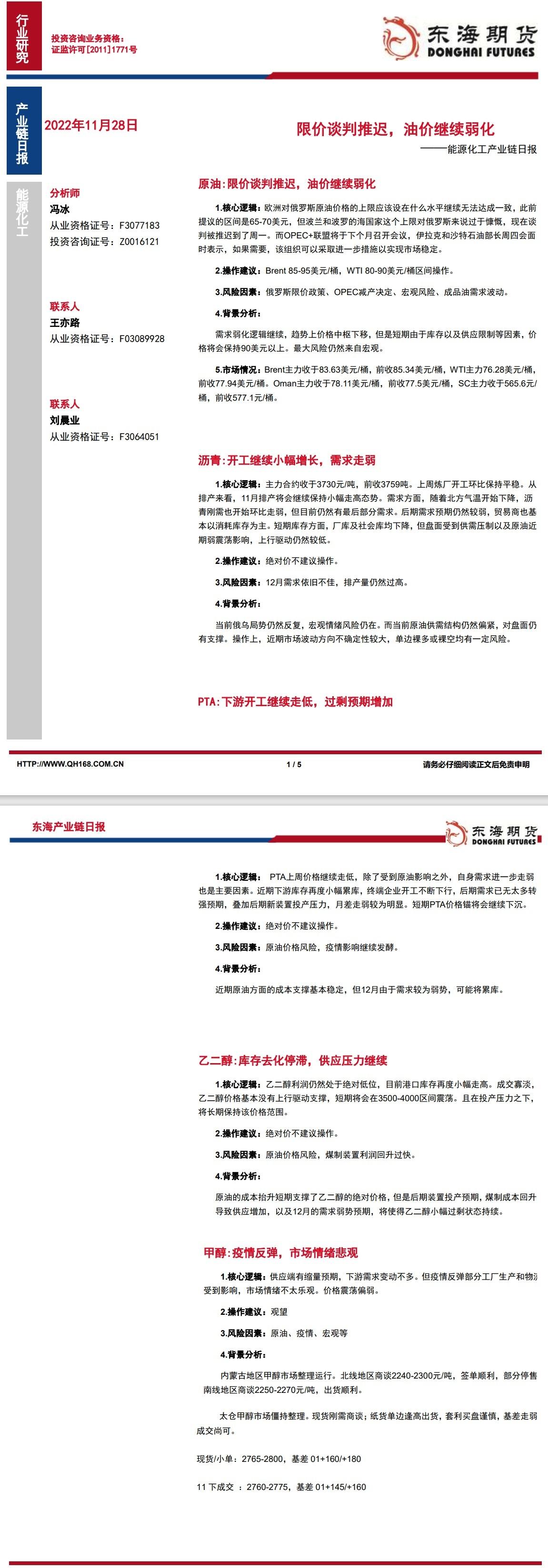 标题:【东海期货11月28日产业链日报】能化篇:限价谈判推迟,油价继续弱化