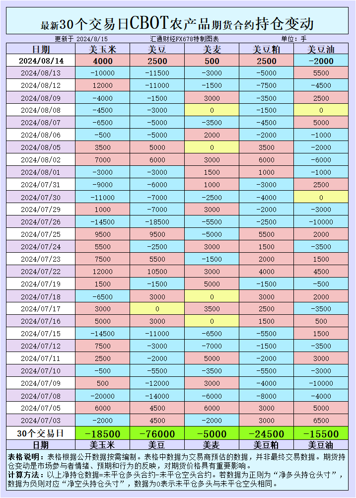知名机构的数据显示,大宗商品基金在8月14日增加了CBOT大豆的投机性净多头,这表明市场对大豆价格的看涨情绪有所增强。然而,从过去30个交易日的数据来看,投机性净空头的增加则反映了市场对大豆价格的长期看跌预期。