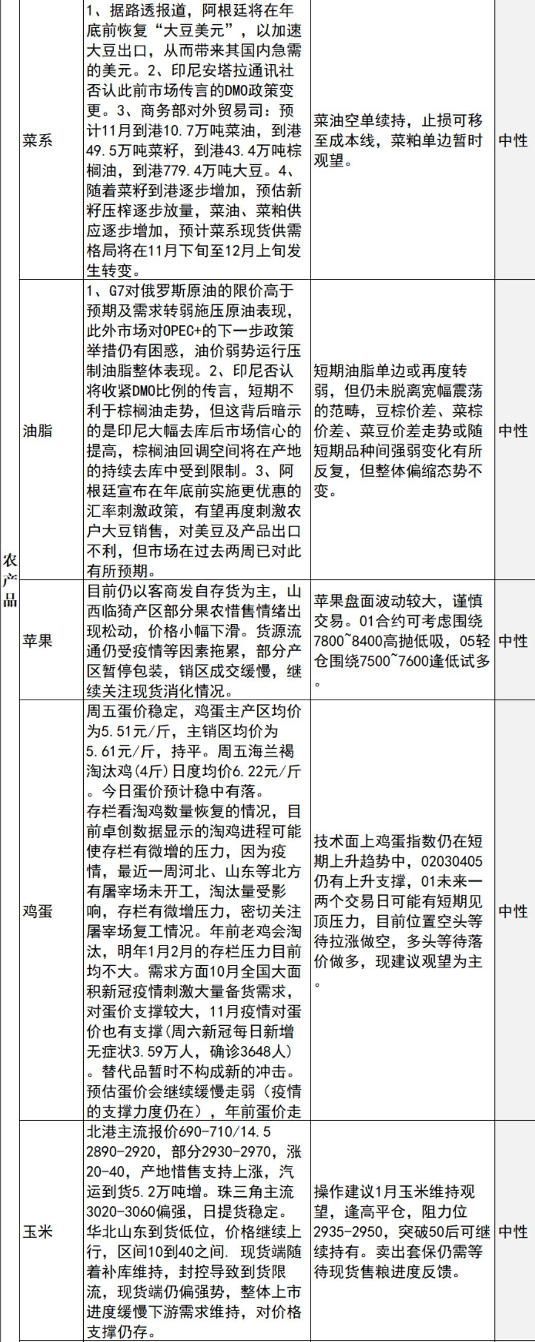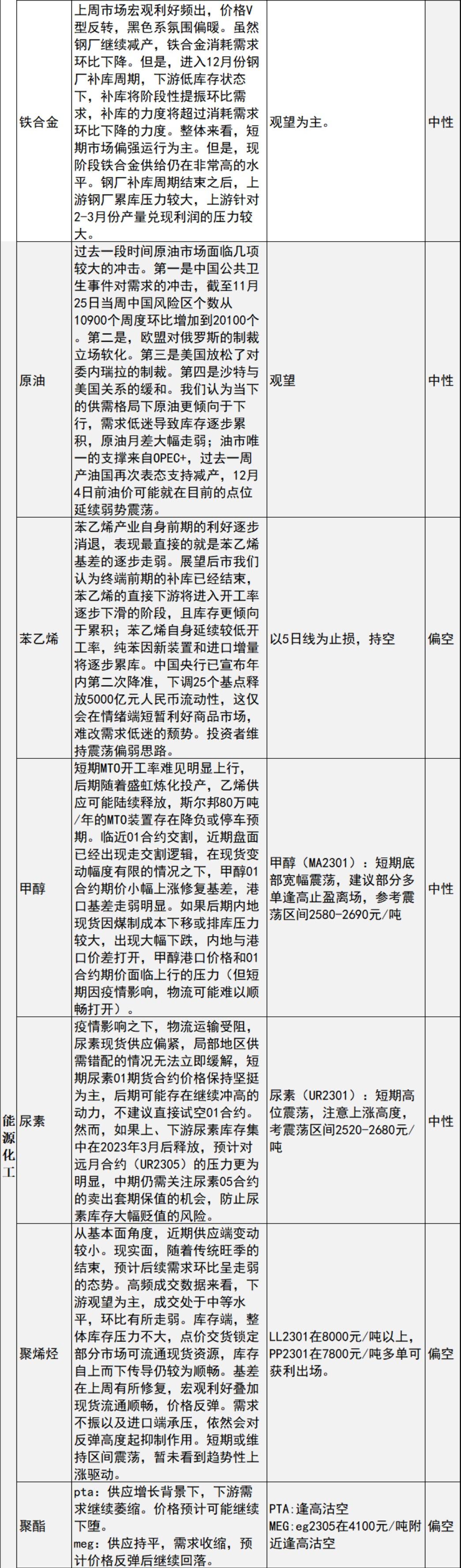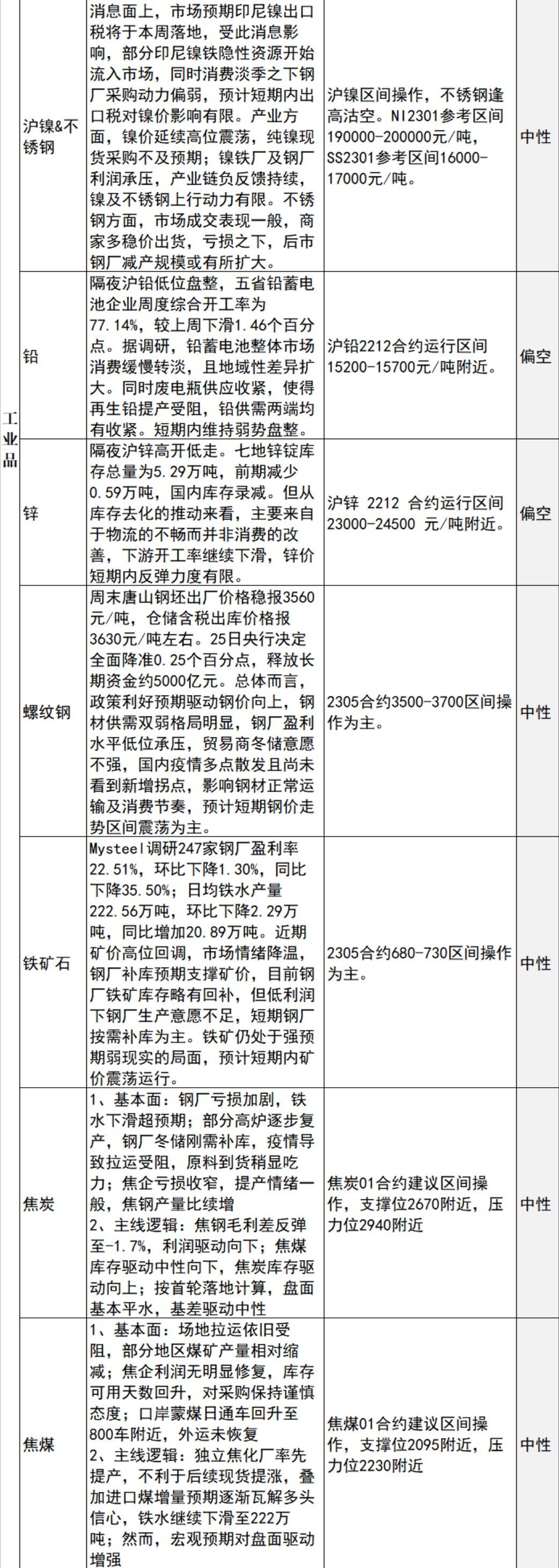 螺纹钢:政策利好预期驱动钢价向上,钢材供需双弱格局明显,钢厂盈利水平低位承压,贸易商冬储意愿不强,国内疫情多点散发且尚未看到新增拐点,影响钢材正常运输及消费节奏,预计短期钢价走势区间震荡为主。