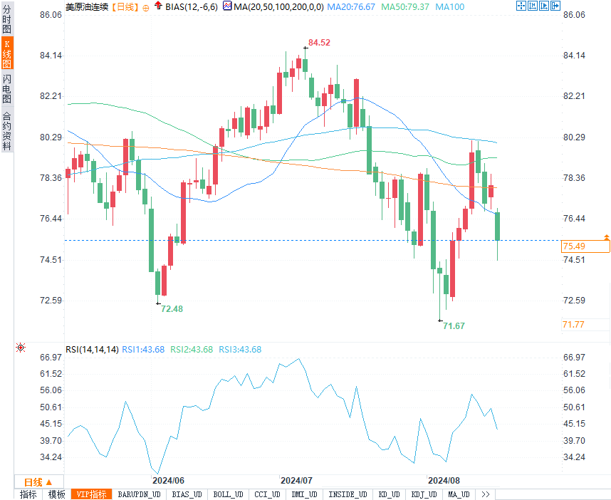 WTI 9月原油期货在周五收跌1.51美元/桶,跌幅超过1.93%,收报76.65美元/桶,而