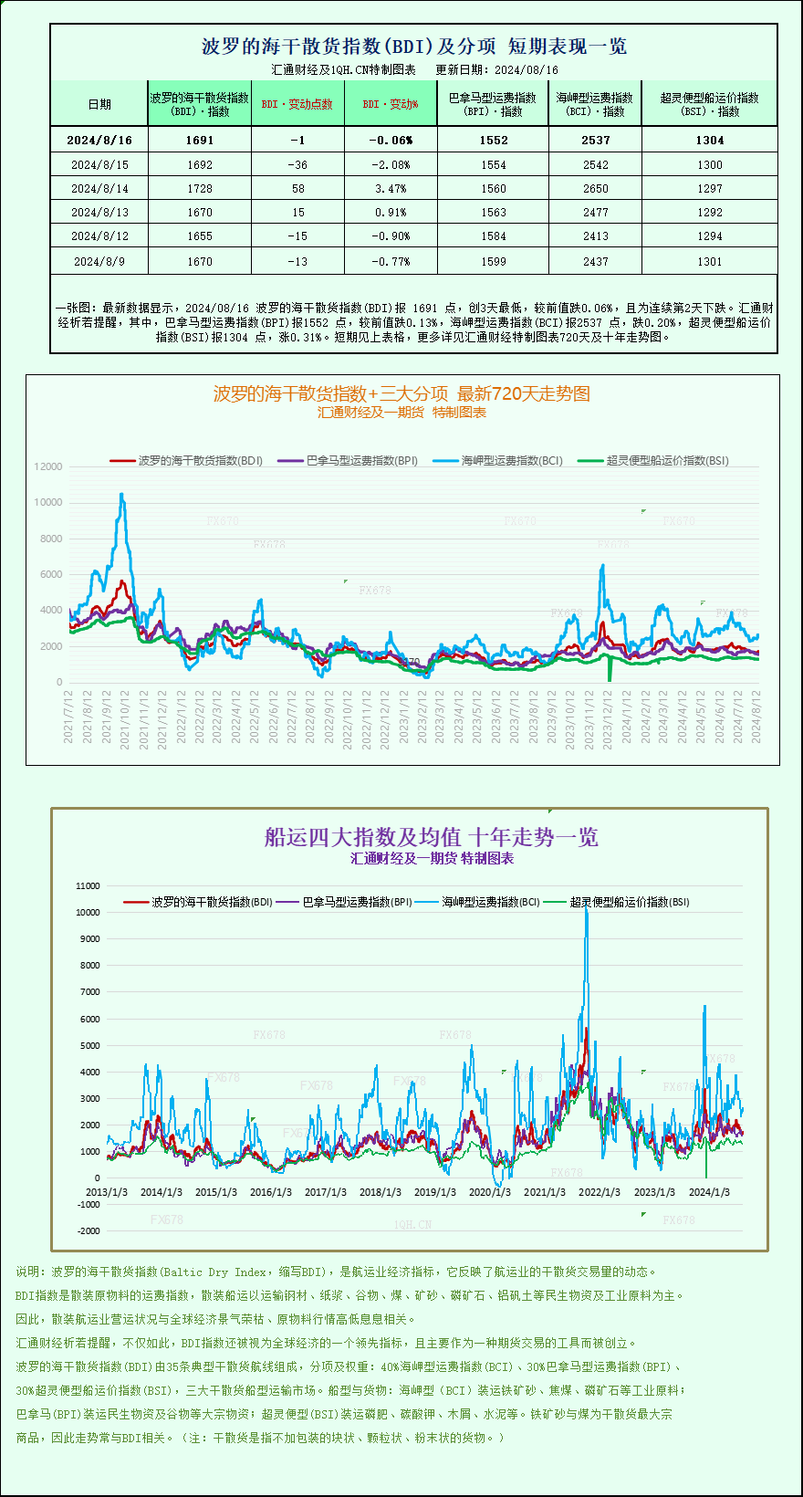 汇通财经APP讯——最新数据显示,2024/08/16 波罗的海干散货指数(BDI)报 1691 点,创3天最低,较前值跌0.06%,且为连续第2天下跌。其中,巴拿马型运费指数(BPI)报1552 点,较前值跌0.13%,海岬型运费指数(BCI)报2537 点,跌0.20%,超灵便型船运价指数(BSI)报1304 点,涨0.31%。波罗的海干散货指数+三大分项的最新720天走势图、十年走势图等详见汇通财经特制图表。