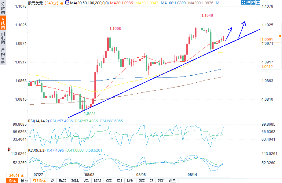 从4小时走势图上看,欧元/美元呈现看涨趋势。该货币对受到上行趋势线的支撑,目前位于轴心点1.09684美元上方。