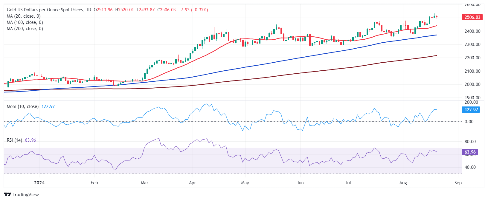 汇通财经APP讯——周四(8月22日)亚市盘中,现货黄金短线突然加速回落,目前金价正逼近2500美元/盎司关口,金价日内重挫逾10美元。FXStreet首席分析师Valeria Bednarik撰文,对黄金技术前景进行分析。