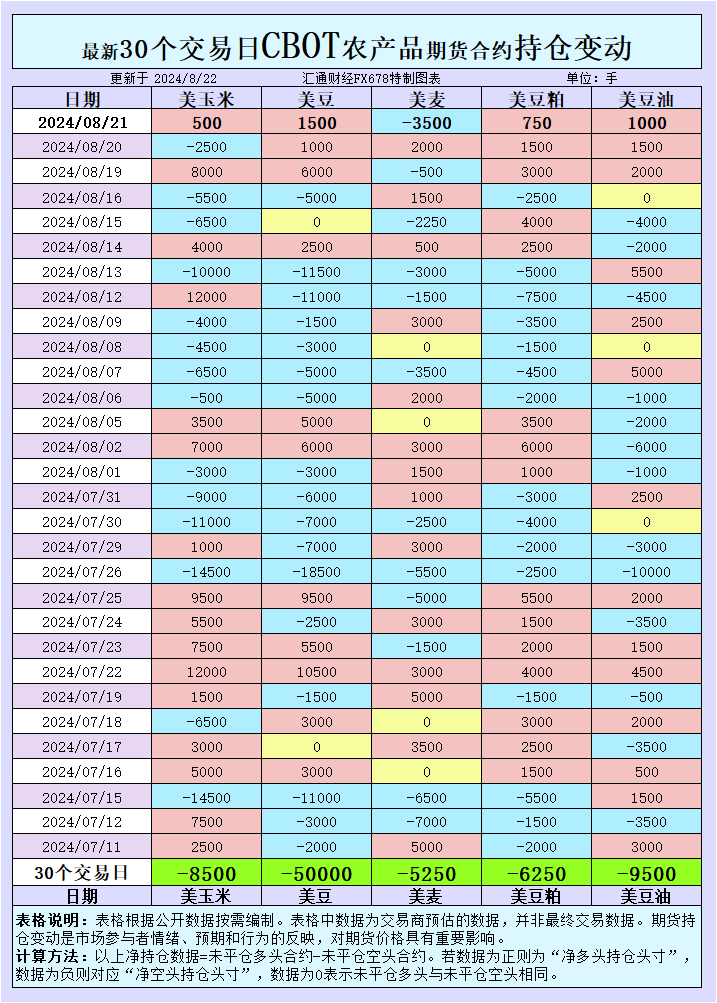 以上分析反映了当前市场的主要变化,并基于最新的持仓数据、基本面和技术面信息,提供了对大豆、豆粕、豆油、小麦和玉米市场的深入分析。希望这篇文章能为您的交易决策提供有价值的参考。