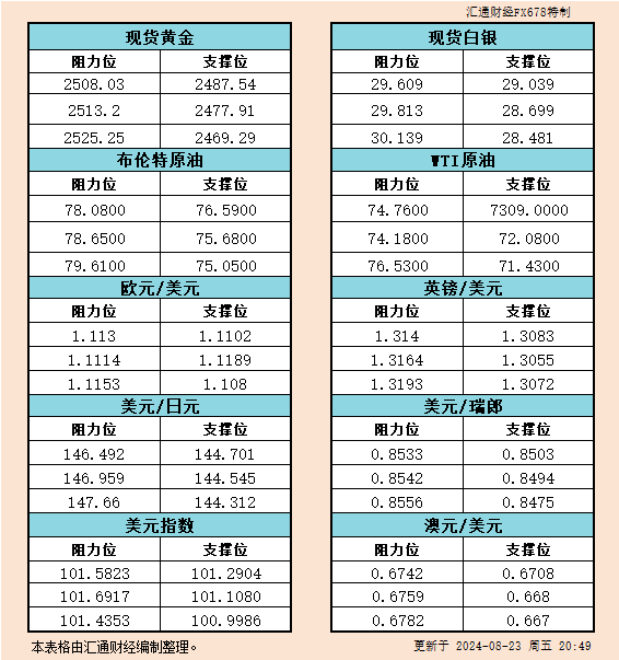 标题:8月23日美市支撑阻力:金银原油+美元指数等六大货币对