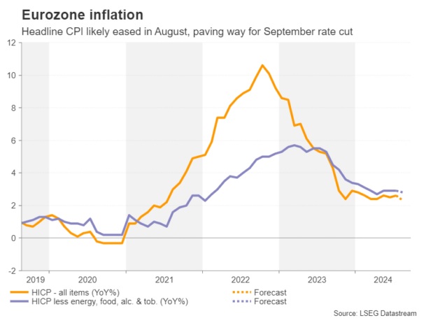 欧元区的总体通胀率预计将从7月份的同比2.6%降至8月份的2.3%,使其更接近欧洲央行2%的目标。剔除所有波动项目的核心通胀率预计将小幅下降至2.8%。
